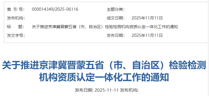近日,京津冀晋蒙五省(市、自治区)市场监管部门联合发布通知,经共同协商研究,决定在区域内全面推进检验检测机构资质认定一体化工作,围绕规范分支机构资质认定管理、统一资质认定标志(CMA)使用管理、建立资质认定协同评审机制、推进授权签字人考题与考核一体化等四方面作出具体部署。