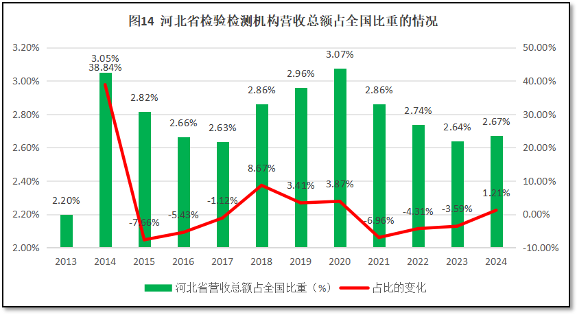由图14可见,河北省检验检测机构营收总额在全国检验检测行业营收总额中的比重总体来看呈现轻微波动的发展特点,在2014年和2020年有两个小的高峰值,占比最高出现在2020年,达到3.07%。最近几年持续下降,2024年度同比增幅为2.67%,较2023年度占比略有回升。从增长率曲线来看,从2015年起,河北省检验检测机构营收总额增长率在2018-2020年为正值,此后基本上一直处于下降的状态,直到2024年度才又有小幅提升。过去10年来的年均增幅为-1.19%,说明河北省检验检测机构经营状况在多数年份是下降的状态。