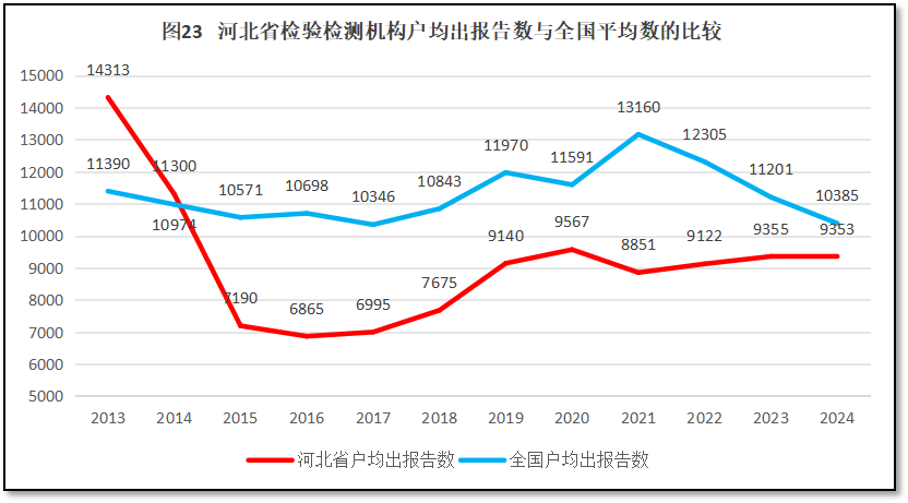 由图23可见,除了2013年和2014年之外,河北省检验检测机构户均出具的报告一直低于全国平均数。近年来,河北省检验检测机构户均出报告数量有所增加,但增量不大(2024年度略微比2023年度出具的报告数量少)。不过,由于全国的平均数近年来下降幅度较大,因此河北省的数据与全国平均数的差距逐渐缩小。