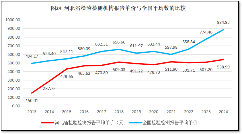 再来看河北省检验检测报告单价的情况,过去12年河北省检验检测报告单价与全国情况的比较,如图24所示。