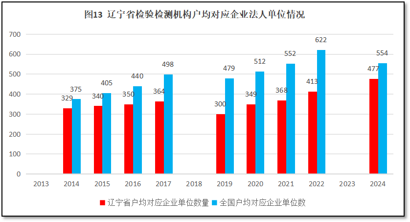由图13可见,12年来,辽宁省检验检测机构户均对应的企业法人单位数量缓慢增加,但一直比全国平均数要低。2024年辽宁省检验检测机构户均对应企业法人单位477个,比全国平均数554个低了77个。
