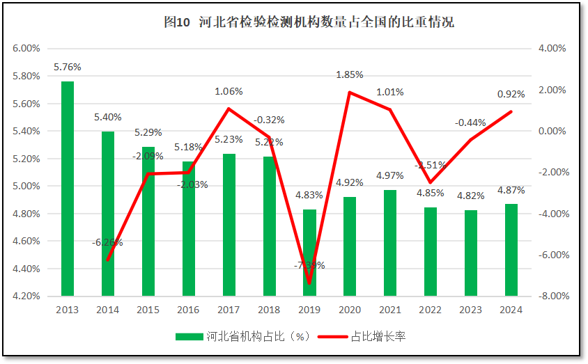 由图10可见,河北省检验检测机构数量在全国检验检测机构总数中的占比总体呈现逐年下降的趋势,年均增速为-1.47%。到2024年末,河北省检验检测机构数量占全国的比重为4.87%,受全国机构总数下降幅度较大的影响,尽管河北省机构数量也出现了减少,但占比反而有轻微回升。从增长率的变化曲线来看,河北省检验检测机构数量占比的变化呈现一个M型的走势,在2017年和2020年有两个微小的增长峰值,在2019年有一个比较大的降幅。河北省作为华北地区的重要省份,拱卫着京津两个特大型城市,既有靠近首都的优势,也有资源被京津两地虹吸的劣势。河北省检验检测行业发展的比较早,检验检测机构数量也很多,但近年来发展速度变慢,行业出现萎缩,在全国检验检测行业中地位不高。