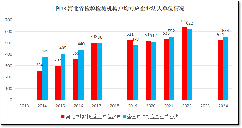 再来看检验检测机构户均对应的企业法人单位数量情况。过去12年河北地区检验检测机构户均对应企业法人单位数量与全国情况的比较,如图13所示。