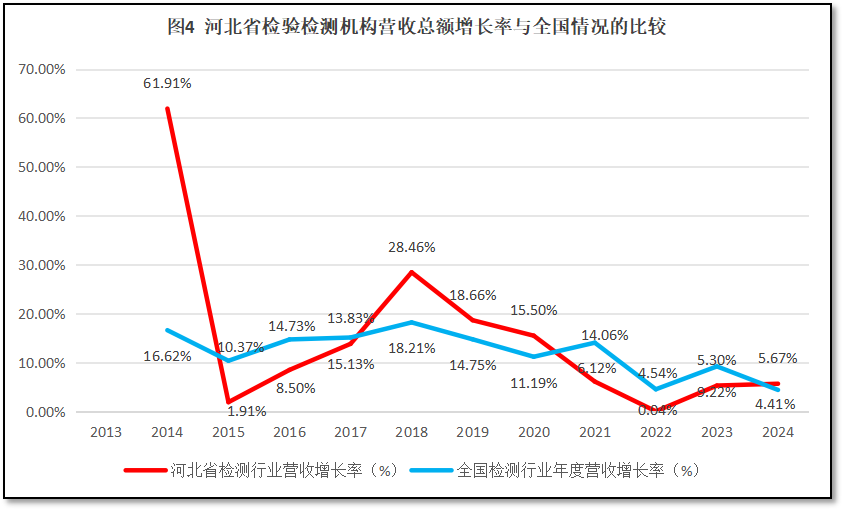 比较河北省检验检测行业年度营收总额增长率与全国检验检测行业年度营收总额增长率随时间的变化,如图4所示。