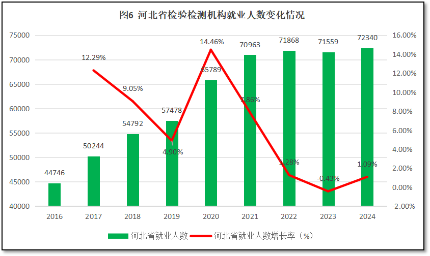 由图6可见,从2016年到2024年,河北省检验检测机构就业人口数量从4.4万多人增长到7.23万多人,年均增速6.31%。不过,2022年之前,河北省检验检测机构就业人数持续增长,到2022年达到7.18万人的高点后基本保持稳定,2023年略有下降,2024年又有所回升,基本保持在7.2万人左右波动。