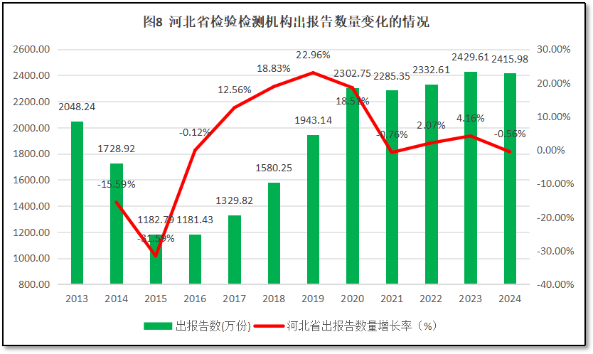从图8来看,河北省检验检测机构对外出具的检验检测报告数量有一个先降后升的变化特点,十分罕见。报告数量在2013-2016年从2048万份开始持续下降,到2015年降到1180万份,几乎腰斩。但在2016年之后又开始持续增长,到2020年达到2300万份左右以后基本稳定,2024年,河北省检验检测机构出具报告数量2415.98万份,较2023年度略微下降,但降幅不大。2013-2020年期间河北省检验检测机构出具报告数量的起伏,除了统计数据误差之外,还可能跟河北省检验检测行业结构性调整改变有关。从2020年以后,河北省检验检测机构出具报告数量总体稳定,没有再出现大的波动。